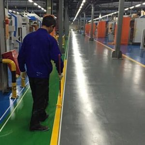 Этапы нанесения эпоксидной краски JINYU PAINT на бетонную поверхность — Базовая шлифовка и очистка—- Ремонт трещин, сколов— Нанесение проникающей грунтовки А159Х JINYU PAINT —Нанесение среднего слоя Е337 JINYU PAINT с кварцевым песком—шлифовка и удаление пыли—Нанесение финишного слоя Е860 JINYU PAINT —Зонирование функциональных зон разметкой.
